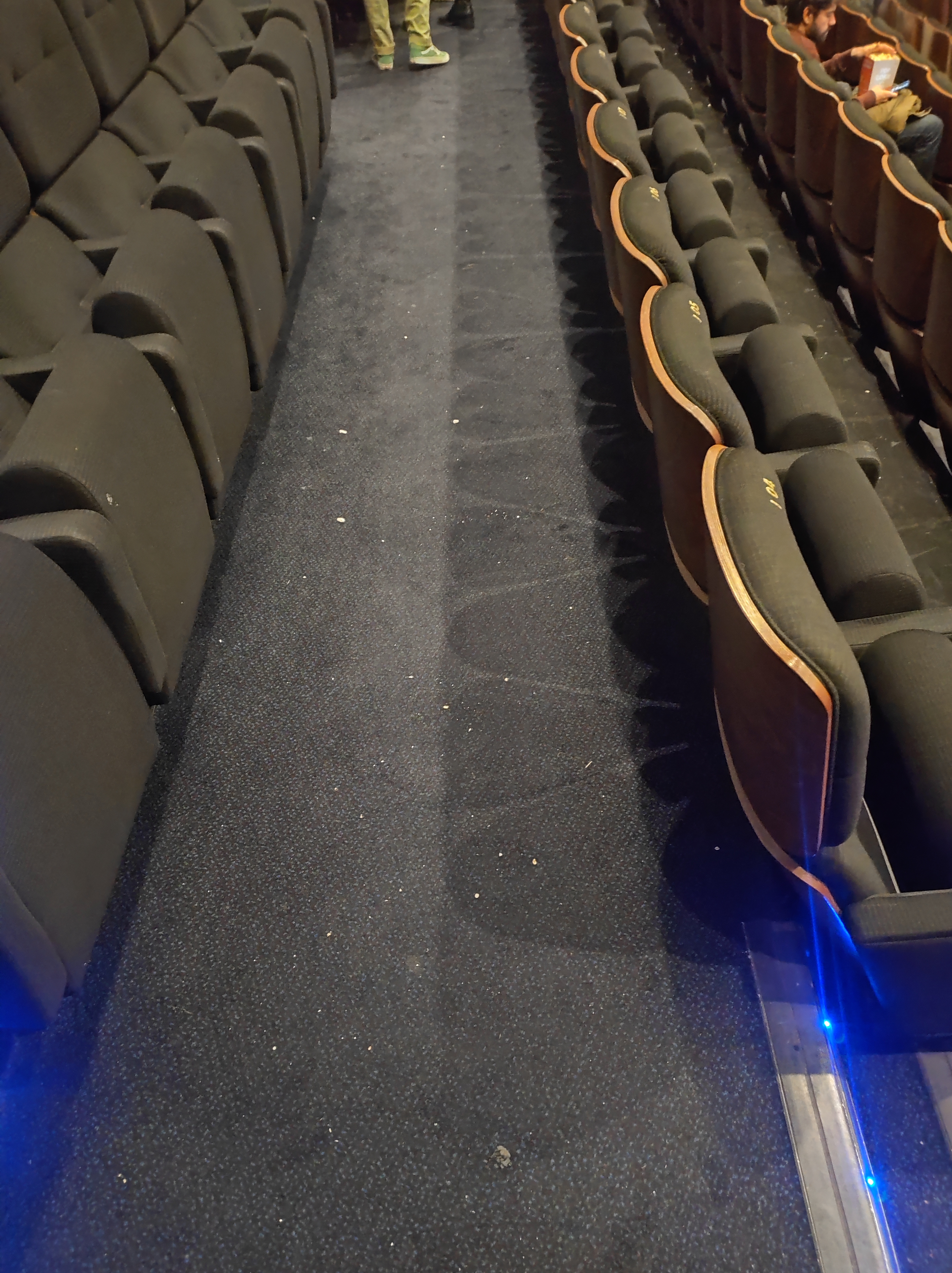 Les déchets jonchent le sol de la salle. Fauteuils avec des tâches. Le sol est collant.. Un tiers monde